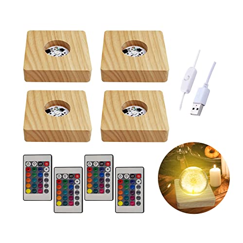 YWNYT 4 st LED-lampor, visningsbas med fjärrkontroll, 16 färgade runda/fyrkantiga träupplysta basstativ för 3D-kristallglas hartskonst (8 cm fyrkantig)