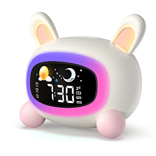 Lemnoi Pedagogisk Barnväckarklocka, Lär dig att Sova-väckarklocka, Ljus Digital Barnväckarklocka med Mån/Sol-visning, 5 Färger, Snooze, 7 Typer av Musik, USB-laddning (Kanin)