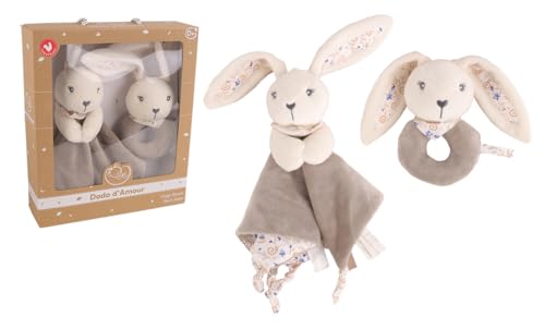 DODO D'AMOUR - Fyrkantig och skallra Doudou - Kanin - 053020 - Blandade färger - Doudou - Födelse - Plysch - Barn - Lugnande - Mjuk - Tvättbar - 29 cm x 22 cm - Från 0 månader