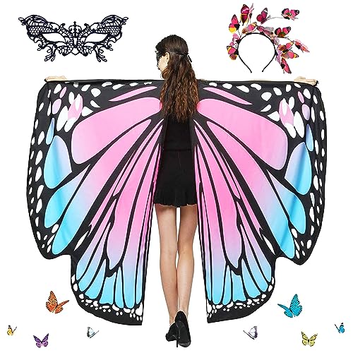DAZZTIME Fjärilskappa damer, damer fjäril kostym kappa med fjäril diadem, fjärilsvingar, damer spets mask färgglad fjäril cape, för halloween karneval party cosplay