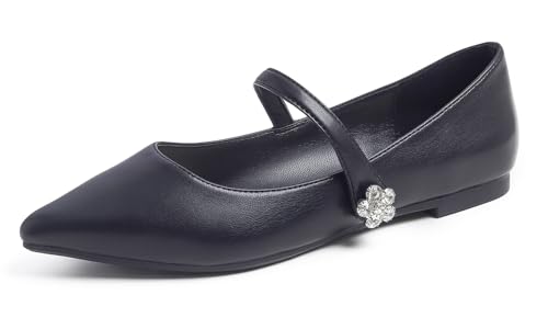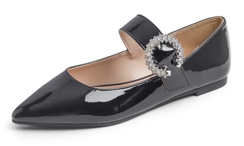 Feversole Women's Pointed Toe Patent Ballet Flat, färgglad Macaron spets spets spets minnesskum kudde för kvinnor lackbalett, Maryjane svart patent strass spänne, 40 EU