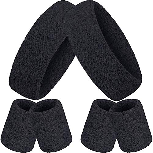 Set med svettband, inkluderar sportpannband och armband svettband färgglada bomullssvettband för män och kvinnor (svart, 6 delar)