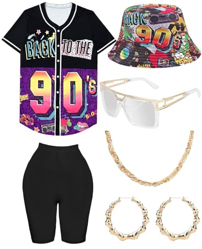 90-tals outfit leggings kvinnor med tillbehör, hiphop-kostym långa lösa toppar yogabyxor fiskarhattar glasögon örhängen halsband, 80-talet färgglada rapperskjorta slagverk move temafest badknapp
