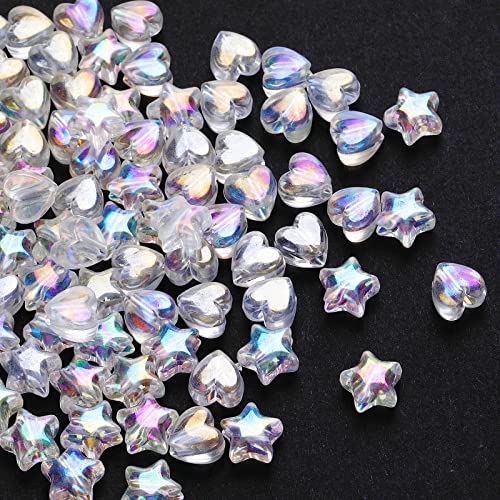 HERZWILD Akrylpärlor i form av hjärtan och stjärnor, 500 stycken, AB-färgbeläggning, snöre, färgglada pastellpärlor, ponnypärlor i blandade färger, charmiga pärlor, söta plastpärlor för halsband, armband, örhängen. (hjärta, stjärna)