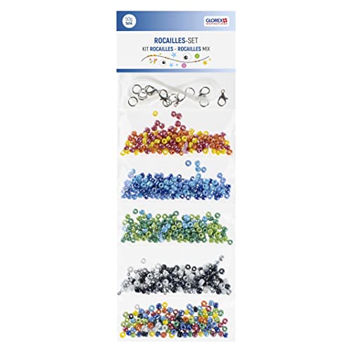 GLOREX 6 1630 301 – Rocailles-set, 50 g, 5 x 1 m, 5-faldigt färgglada sorterade, med snören och spännen, perfekt för att designa smycken, armband, halsband, tillbehör och dekoration