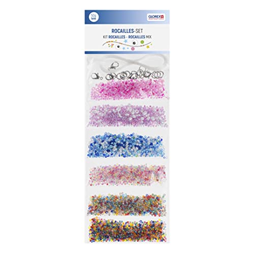 GLOREX 6 1630 300 – Rocailles-set, 50 g, 5 x 1 m, 6-faldigt färgglada sorterade, med snören och spännen, perfekt för att designa smycken, armband, halsband, tillbehör och dekoration