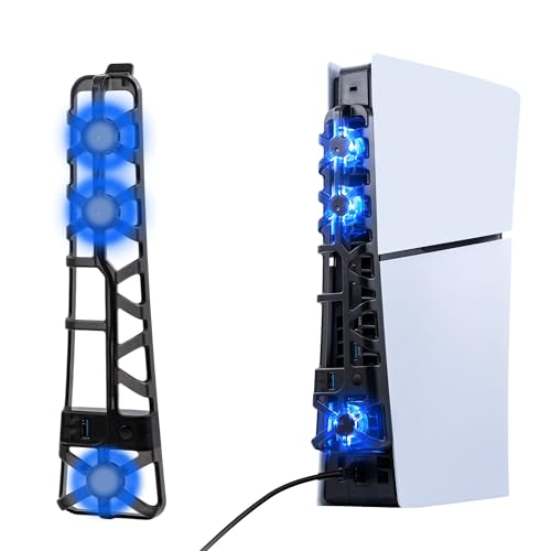 Tolesum Kylfläkt för PS5 Slim med färgglada LED-ljus, tyst fläkt med temperaturkontroll för PS5 Slim Digital/UHD-konsol, 3 fläktar, USB 3.0-port - svart