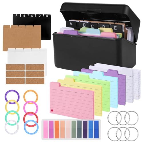 EOPUOZS Flashcard-låda svart, 15 x 9,5 x 8,5 cm, inklusive 230 flashcards, färgglada, linjerade, 15 flikar, 6 ringar, 6 klistermärken, indexkort för resor, lärande