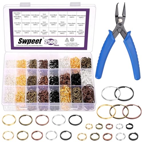 Swpeet 2501 st färgglada 5 storlekar 3 mm 5 mm 8 mm 10 mm 14 mm små metalldelade ringar ringar ringar med delad ring öppnings tång, dubbelstängda öglor, hoppringar för nyckelringar smyckestillverkning