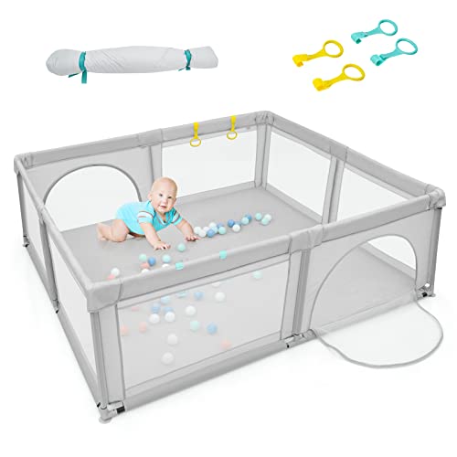 LIFEZEAL Barnlekhag, inhägnad av tyg och ventilerande nät, lekhage för barn med 4 ringar och 50 färgglada bollar, babylekhage 0–36 månader (grå 206 x 185,5 x 68 cm)