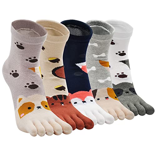 ZFSOCK Dam Tåstrumpor Bomull Roliga: Fem fingrar Strumpor Färgglada Sport Strumpor med Tår för Kvinnor Djurmönster Hundar Katter EU 36-41, 5 Par