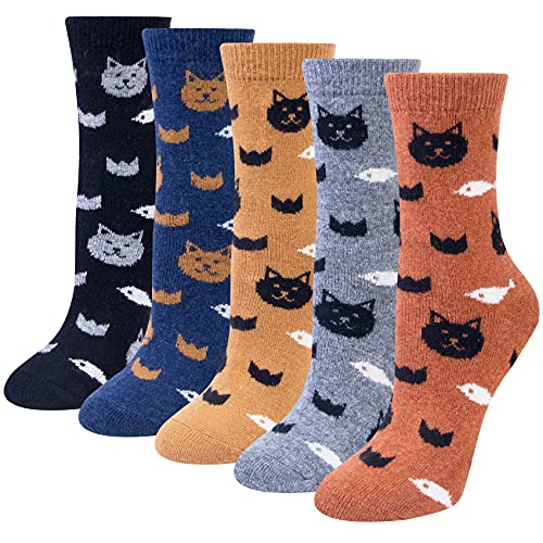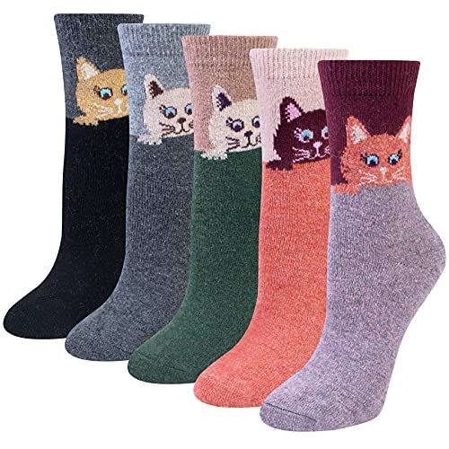 Chalier Cozy Vinterstrumpor i merinoull, damullstrumpor med söt katt, djurmönster, varma, tjocka, färgglada stickade strumpor, termostrumpor, gosiga strumpor dam, storlek 36–42, 36-42 EU