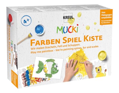 KREUL 29100 – Mucki fingerfärg, färgspel låda, vi blandar, måla, pricka, lärande och lekset, 5 x 50 ml fingerfärg, 2 små burkar för att blanda färg och 10 målarbilder