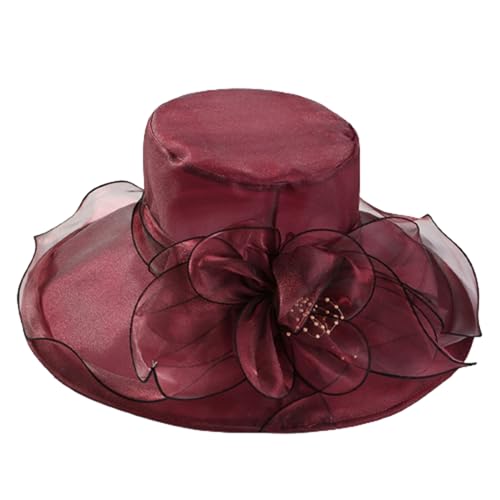 HIQIU Damer kyrka derby sommar brett brätte hatt damer solhattar organza vikbar fascinator-keps strandmössa brud bröllop fest hatt, Vinröd, 57/58 cm