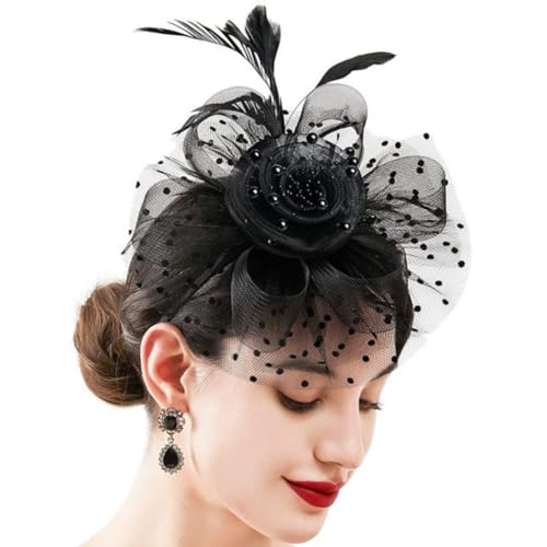 Yphzmtz Fascinator-hatt för damer, nätblomma, fjäderhatt med pannband och klämma, elegant damhatt, teparty, huvudbonad, svart, En Storlek