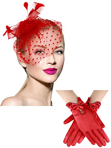 50-talet fascinator hatt för kvinnor pillbox violer hatt cocktail te party spets handske, röd, M