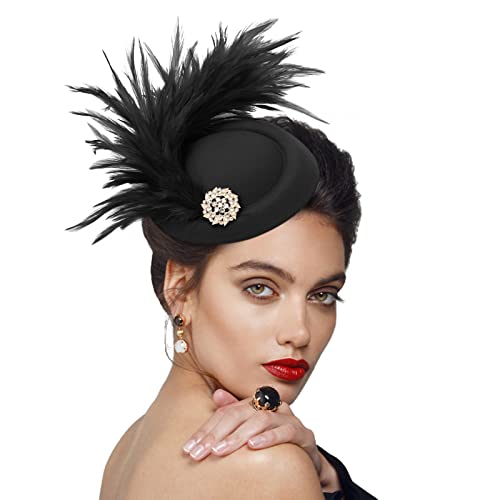 Dimeho Fascinator-hatt kvinnor slöja fjädrar fascinatorer hårklämma 20-talet hattar med slöja vintage hatt elegant cocktail te partyhattar, Svart, one size