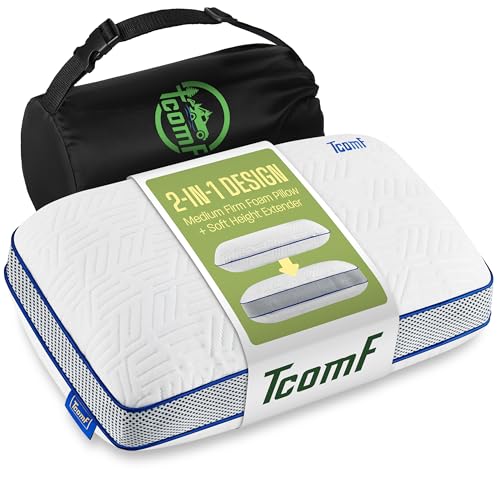 TCOMF 100% minnesskum kudde – resekuddar med dubbla skydd med mjuk höjdförlängare – medium fast skum – campingkudde för att sova med 5 lager för komfort och stöd – liten och bärbar (vit)