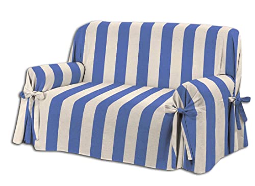 HomeLife Fåtöljöverdrag med armstöd av bomull tillverkad i Italien | 1-sits fåtöljöverdrag med spetsar | Blått brett randigt sofföverdrag för skydd mot damm, fläckar och slitage
