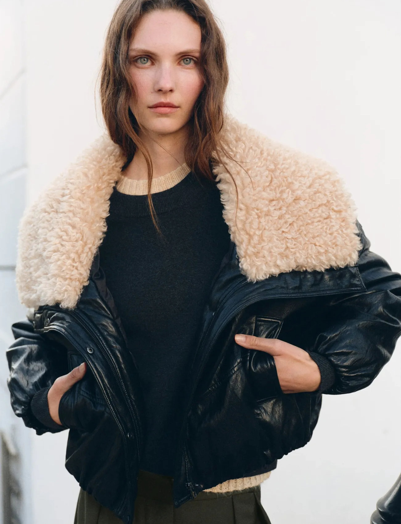 Mango Faux-Leather Jacket With Shearling Collar - Black - S
