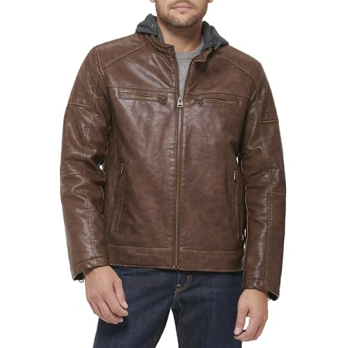 Levi's Men's Faux Leather Hooded Racer Jacket, Saddle, Large