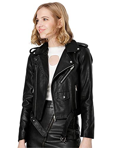 Jhichic Women's Faux Leather Textured Short Moto Jacket Zip-up Slim PU Biker Coat with Pockets (Black, M)