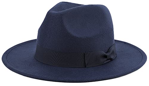Besoogii klassisk bred kant kvinnor män Fedora hatt med bältesspänne filt panamahatt, Rosett-marinblå, one size