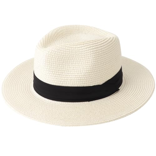 HEYANN Unisex Fedora-hatt, Fedorahatt i nät för män, Trilby halmhattar för sommar, Panama Beach Solkeps, rullat brätte sommarhattar för kvinnor och män, mjölkvit 2, L
