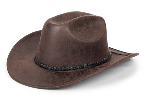 INOGIH Västerländsk cowboyhatt för män kvinnor klassisk PU-läder Roll Up Fedora hatt Outback turist riddarhatt, Brun med bälte, M
