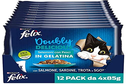 FELIX Le Ghiottonerie Doubly Delicious våt mat för vuxna katter Godis med lax och sardin, öring och makrill 48 x 85 g kuvert