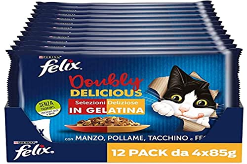 Purina Felix Le Ghiottonerie Doubly Delicious Mat för katter med nötkött och fjäderfä, väska och lever, 48 påsar med 85 g vardera
