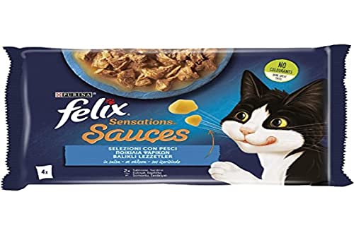 Purina Felix Sensations Sauces Fuktig mat för katter med lax i Smaksås Räkor och med sardiner i sås med morötter, 4 påsar om 85 g vardera