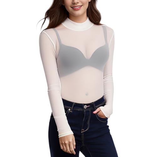 FANGCCC Nättopp damer, sexig festival topp damer transparent nät topp transparent nät topp transparent tyll nät topp casual långärmade toppar för fest, Vit, M