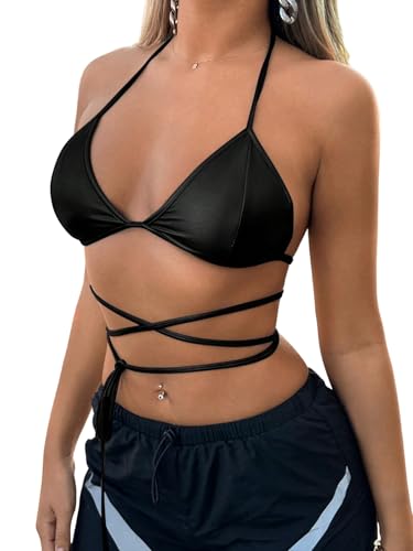 GORGLITTER Damtopp, halterneck, sommartopp, rygglös festtopp, mikrocroptop med bindeutseende, magfri topp, bandtopp, festival, toppar, semestertopp, svart, M