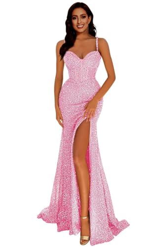 Sjöjungfru paljetter festklänningar för kvinnor rygglös brudtärneklänning med V-ringning formell aftonfest festklänning med lång öppning, Färg: rosa, 10XL Grande