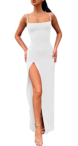 PRIMODA Spagettirem för kvinnor, rygglös lårhög slits bodycon maxi, lång klänning, klubb, festklänning, Vitt, M