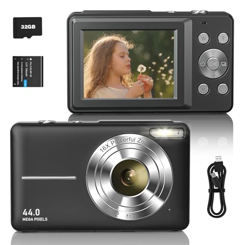 44 MP FHD 1080P digitalkamera, med 32 GB kort, 16x digital zoom, bärbar och lätt att använda för barn, studenter, tonåringar, nybörjare och seniorer