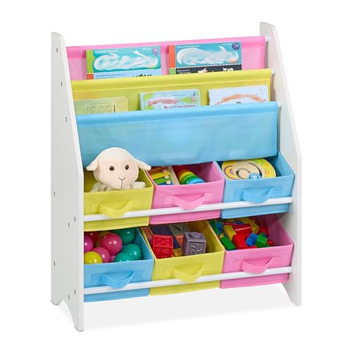 Relaxdays, Barnhylla, leksaksförvaring, plastlådor, bokhylla, MDF, H x B x D: 88 x 108 x 29 cm, fiberplatta