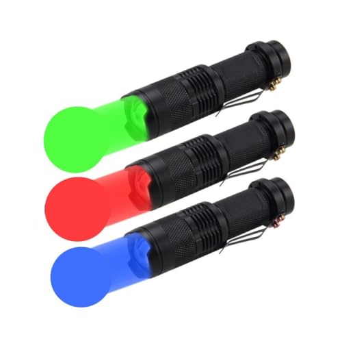 MODOAO röd blå grön LED-ficklampa 3-pack zoombara vattentäta 3 ljuslägen justerbar spotlight för camping, jakt, vandring, nattfiske, astronomi och emergencies (svart väska)