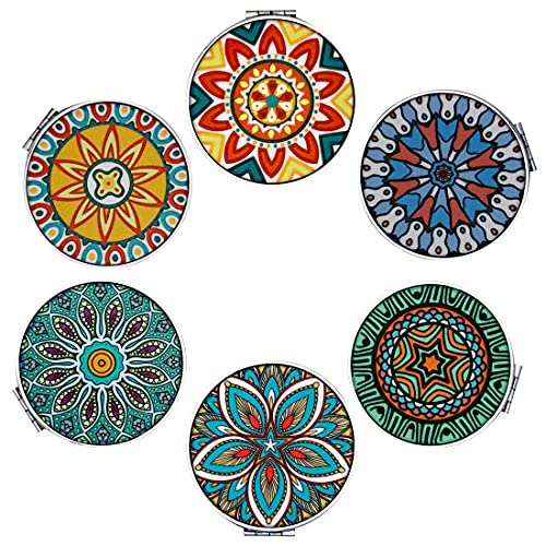 Beaufy Liten Rese Förstorande Sminkspegel Bulk Kompakta Spegel Mini Rund Handhållen Hopfällbar Bärbar Handväska Handväska Fickspegel Set Präglad Mandala Design för Flickor Män Kvinnor Barn Paket om 6