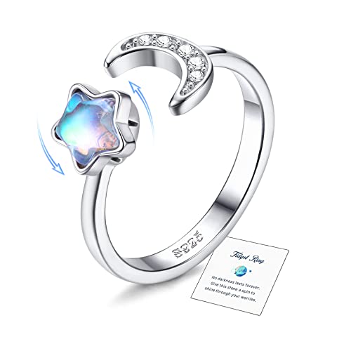 ADRAMATA 925 sterlingsilver ångestring för kvinnor 18K vitpläterad månsten kubisk zirkonia öppen ring för anti-stress justerbar stjärna måne spinner ring fidget ring för ångest kvinnor, Vitt guld Silver, Kubisk zirkonia Månsten