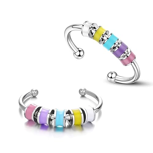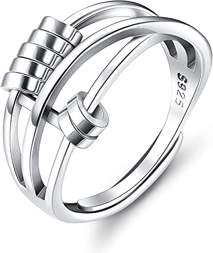 Cangall Silver ångestringar, 2 st 925 sterling silver fidgetringar set, öppna justerbara ångest fidget ringar med pärlor, oändlighet fiol hand spinner ring för ångest stress oro kvinnor män dotter, En