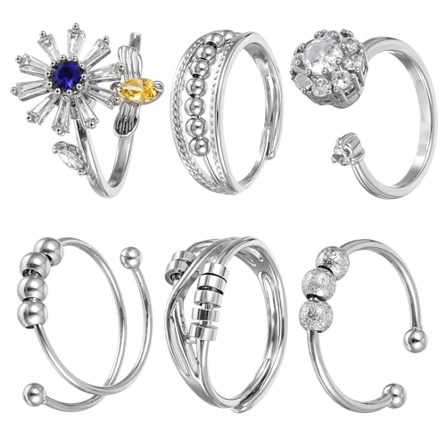 Yuanchu Anti-ångest fidget ring för kvinnor, 6 st öppna justerbara fidgetringar ångestring blomma bi pärlringar söta präglade föremål gåva
