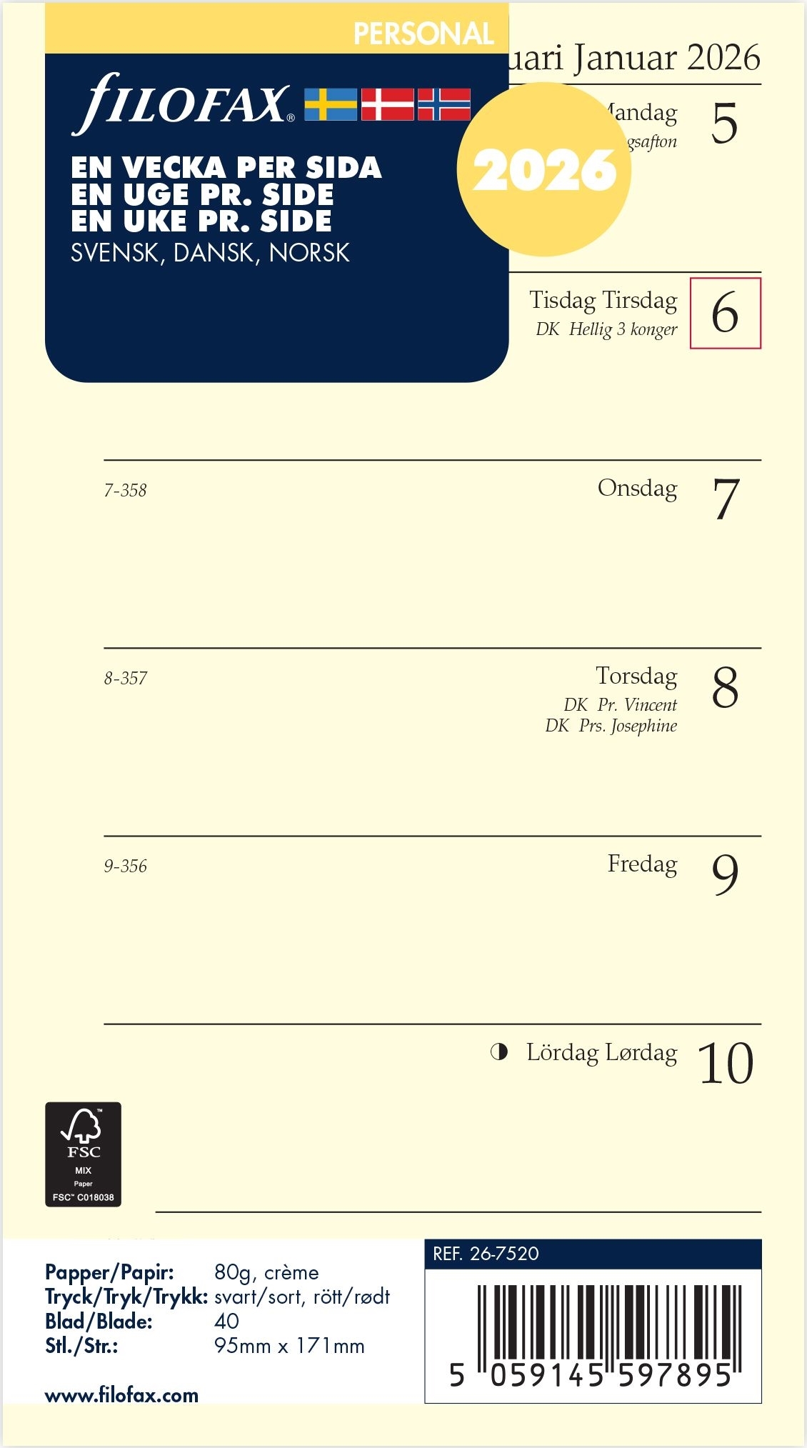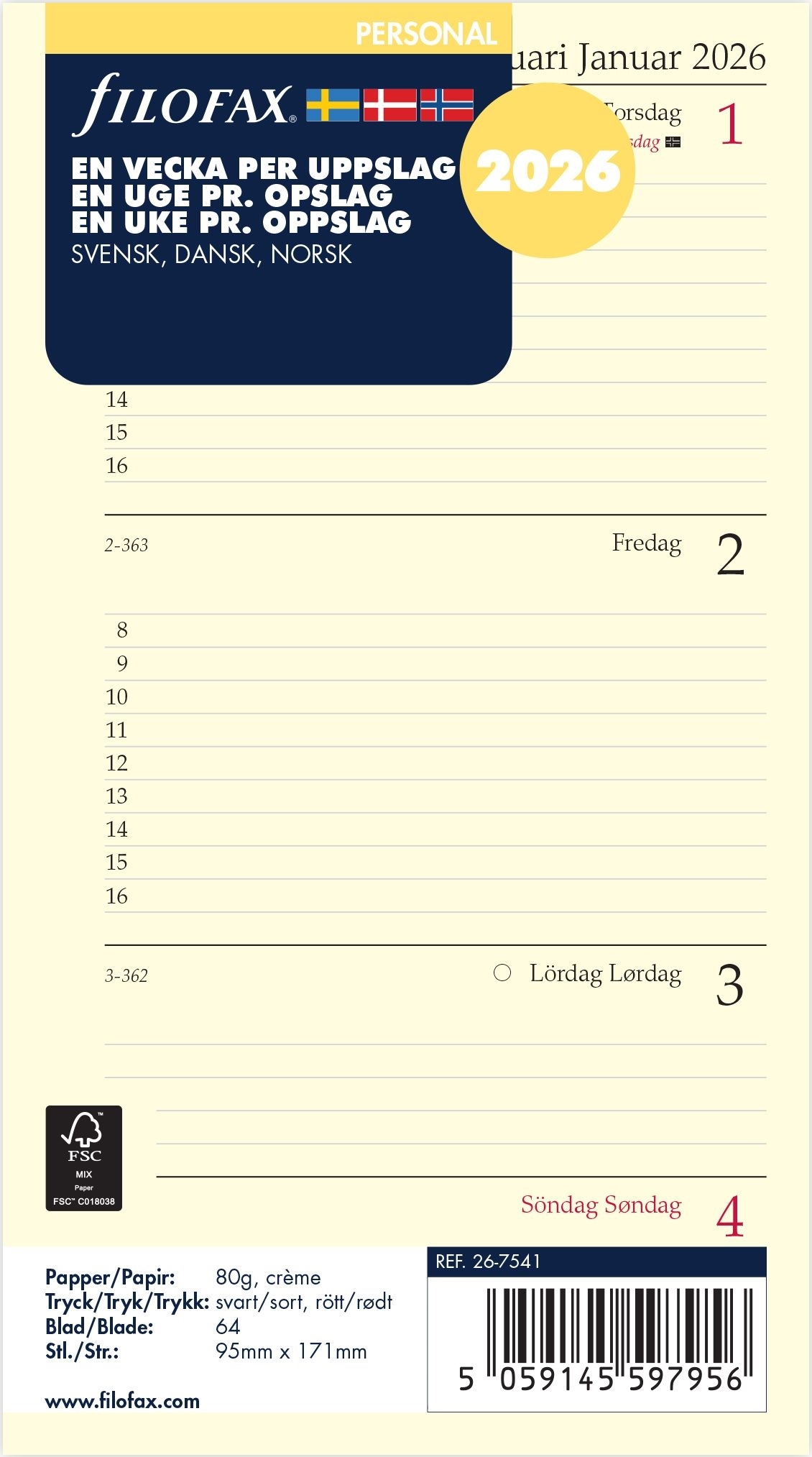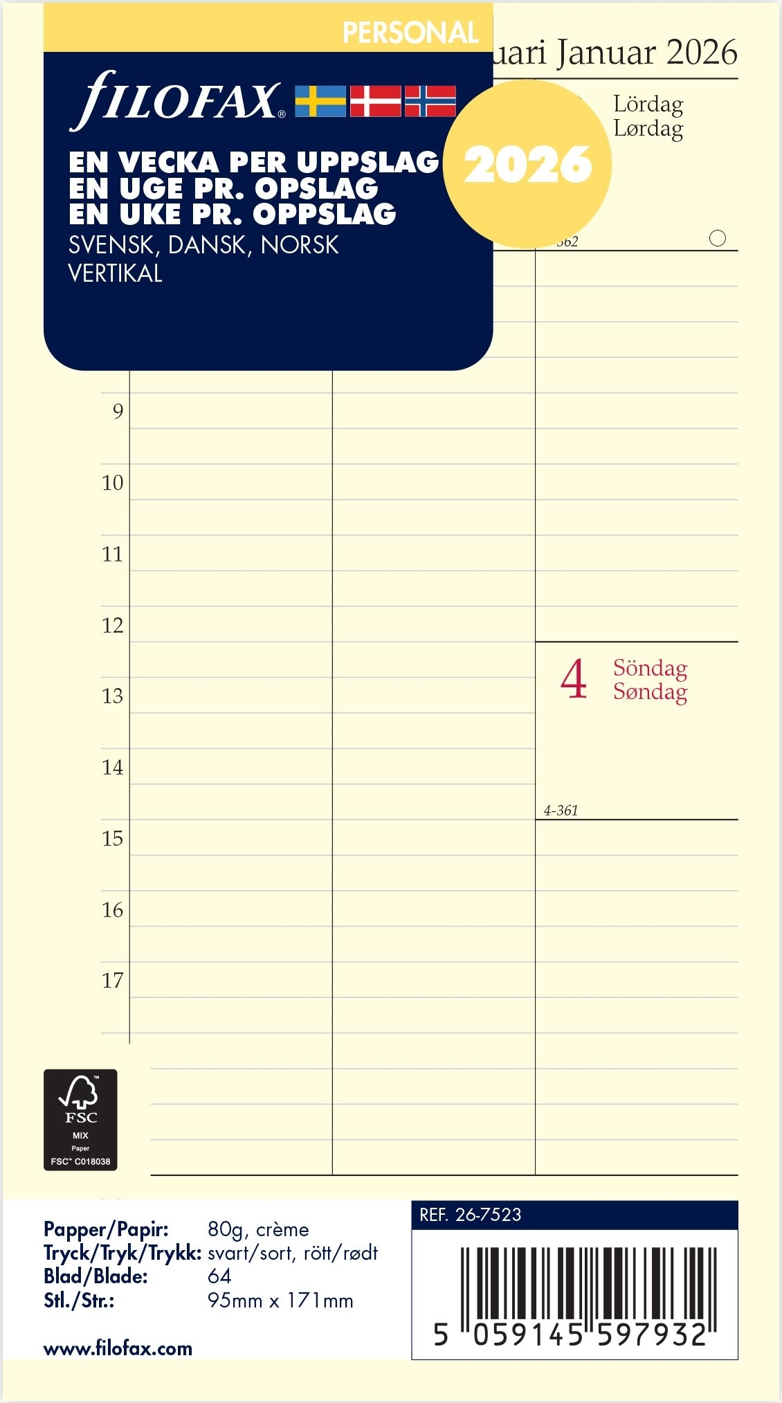 Filofax Personal Dagbok refill 2026 v/u vertikal