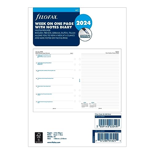 Filofax Kalender Påfyllning, A5-storlek, vecka på en sida med anteckningar, vitt papper, flerspråkigt: Fem språk, 2024 (C68509-24)