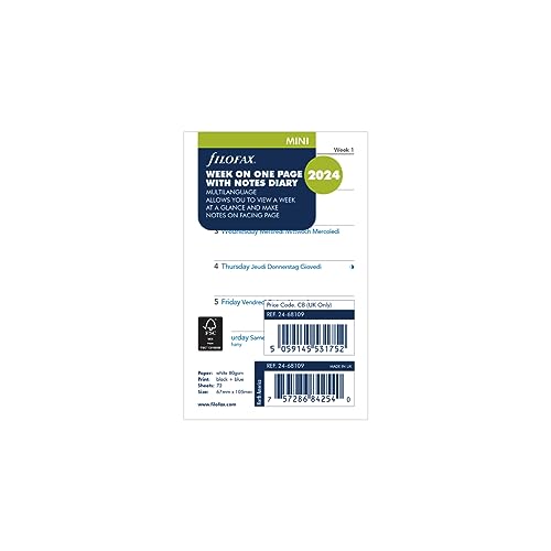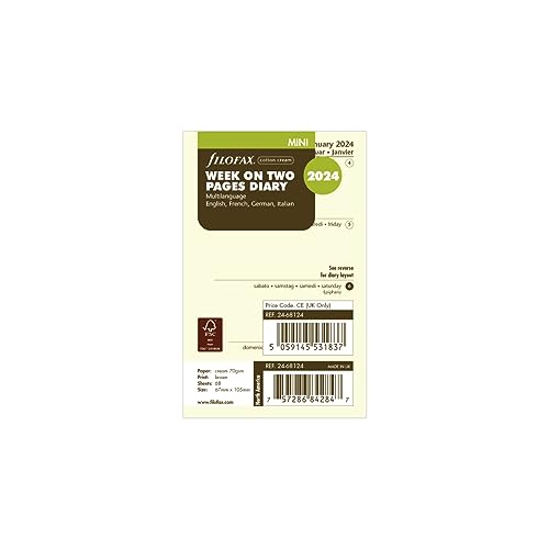 Filofax Mini vecka på två sidor 4 språk 2024 dagbok påfyllning, vit