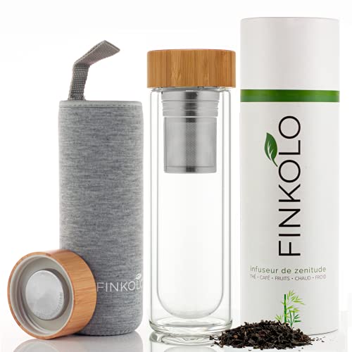 Finkolo isolerad glasflaska - tebryggningsflaska - termos, kaffe - fruktjuiceflaska - Borosilikat dubbelvägg med filter i rostfritt stål, bambu lock, lock - 420 ml