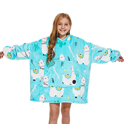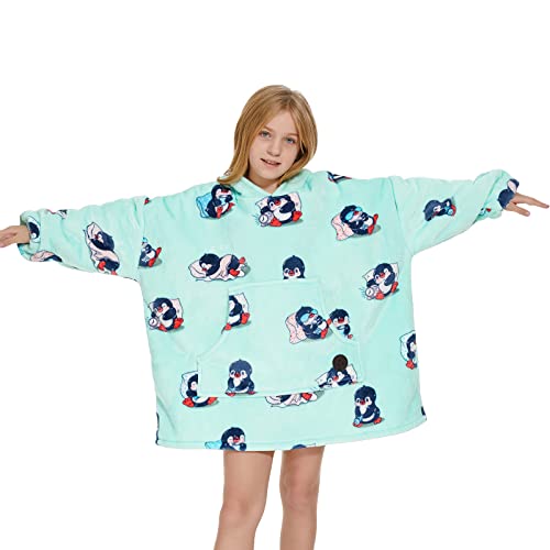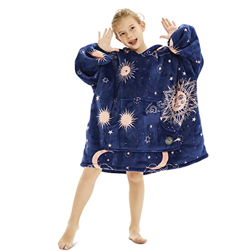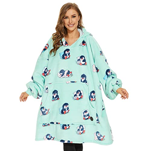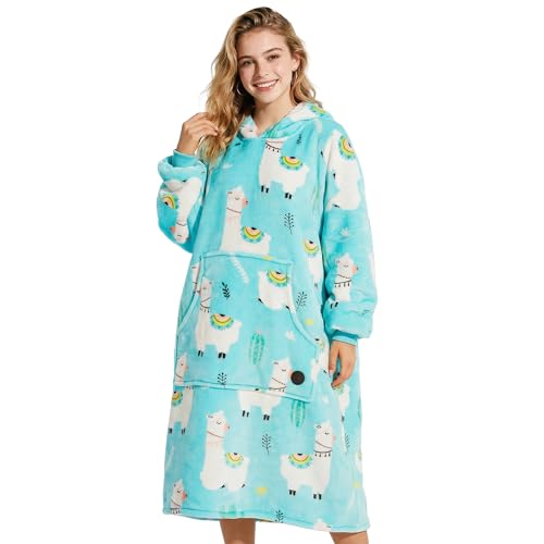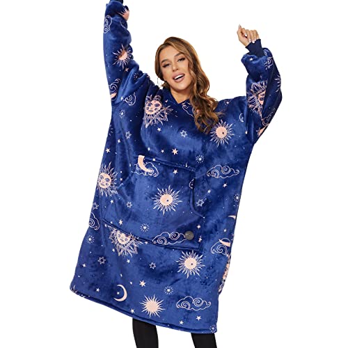 Waitu Bärbar filttröja gåvor för kvinnor och män, supervarm och mysig gigantisk filt huvtröja, tjock flanellfilt med ärmar och gigantisk ficka – blå