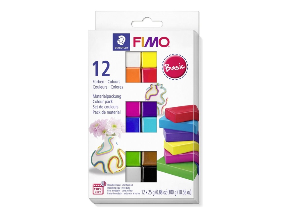 Fimo Soft Basic - Modeling Clay Set - 12 Delar - 300 G - Vit, Citron, Hallon, Indianröd, Brilliant Blue, Pepparmint, Orangeröd, Tropikgrön, Plommon, Caramel, Dolphin Gray, Svart