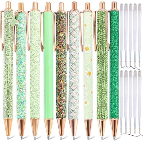 mumrap 9 st glittrande pennor för kvinnor fina pennor med 10 st svart bläck påfyllningar glitter vackra pennset för damer kontor skolgåvor (grön)